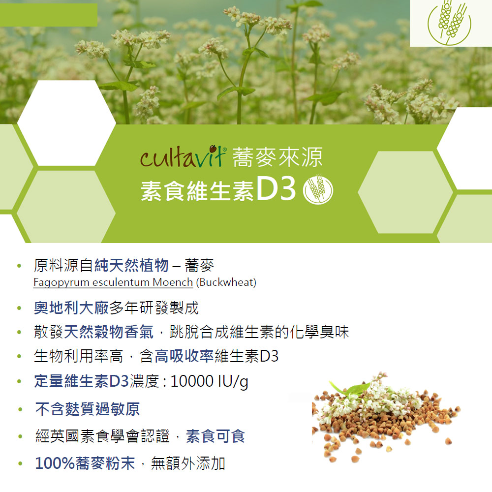 Cultavit®為奧地利原廠NEM VertriebsgmbH 公司的註冊商標,經NEM VertriebsgmbH 公司授權台灣艾維特生技有限公司,使用其註冊商標及蕎麥D3原料於台灣生產製造與銷售。